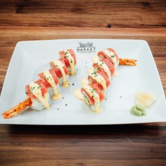 Atún, aguacate y queso crema, cubierto de atún marinado