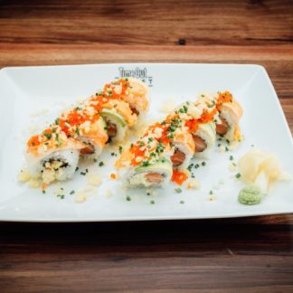 Salmón, aguacate, langostino cocido, col, tobiko, cebollino y salsa picante