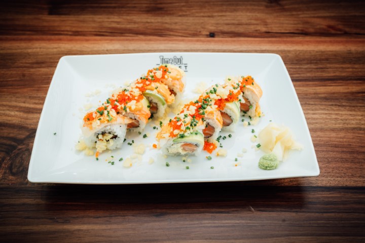 Salmon, avocado, cooked prawn, cabbage, tobiko, chives, and spicy sauce.