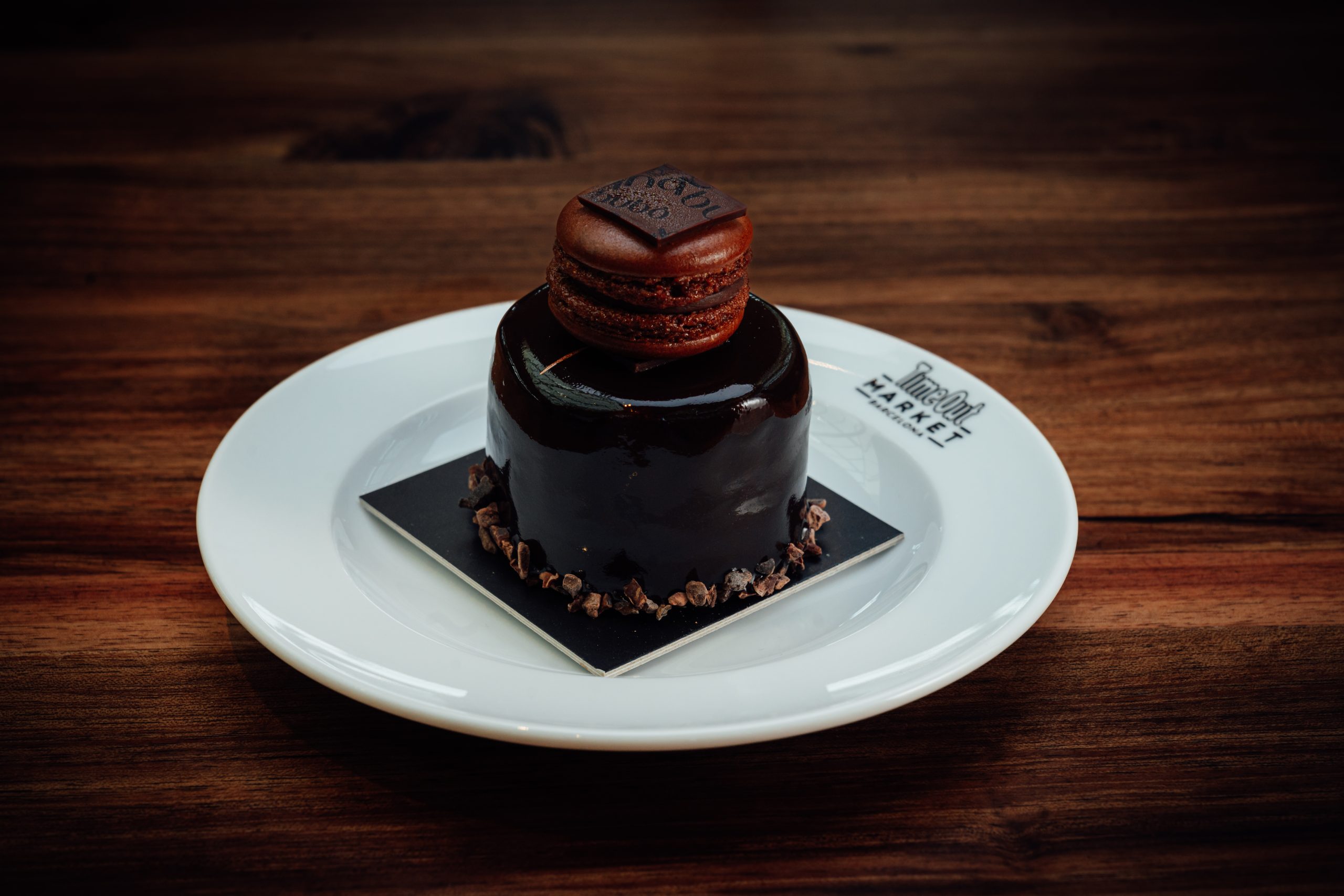 Pastel elaborado con una base de bizcocho de almendras, aceite de oliva y especias con crujiente de praliné de chocolate, fina galleta y almendras, mousse de nata y chocolate negro con capuchina de vainilla y recubierto con un brillante glaseado negro