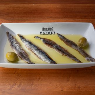Boquerón limpio sin espinas y marinado con agua, vinagre, ajo y perejil. De guarnición lleva oliva rellena de anchoa y guindilla vasca encurtida.