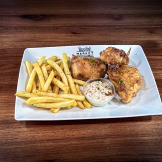 Bacalao frito marinado en pimenton, ajo y zumo de lima con patatas.