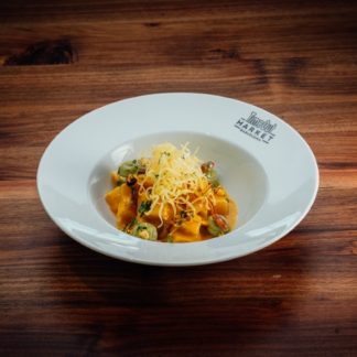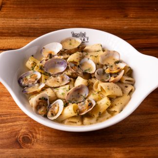 Rigatoni con almejas salteadas en caldo de pescado y marisco.
