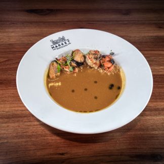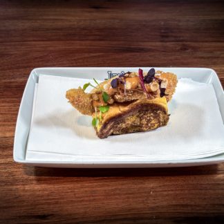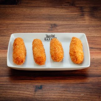 Croqueta hecha con leche y caldo de marisco rellena de gambas y un sofrito de cebolla y carne de centolla limpia