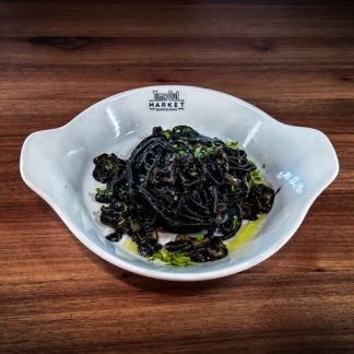 Espaguetis con caldo de marisco y cangrejo salteado.