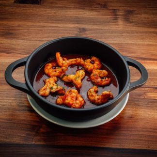 Gambas peladas y salteadas con una salsa de tomate, ajo, polvo de cayena y caldo de gambas y ajo