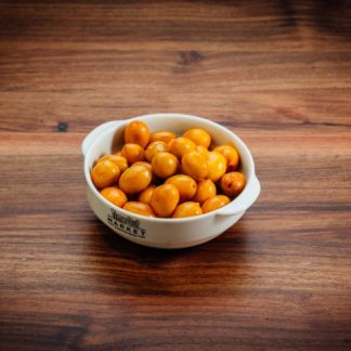 Olivas maceradas al mojo picón (salsa típica de las islas canarias) y mezcla de especies: ajo granulado, pimentón, comino molido, cayena molida