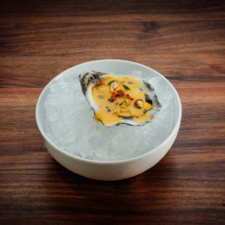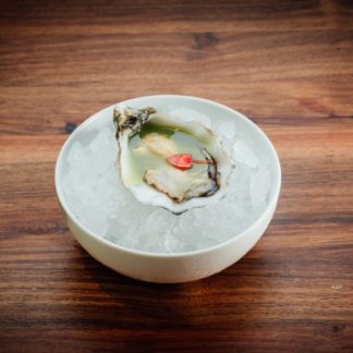 Ostra limpia con salsa japones cítrica a base de salsa de soja tamari sin gluten con ajo, jengibre, lima y yuzu (limón japonés)