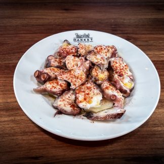 Pulpo hervido y cortado acompañado de unas patatas panaderas hervidas, aceite de oliva y pimentón
