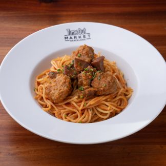 Spaghetti with pork meatballs in cuttlefish, squid, and shrimp sauce