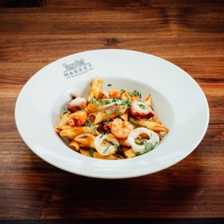 Macaroni with squid, prawns, sautéed tomatoes, and seafood sauce