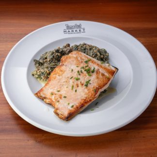 Roasted salmon with sweet and sour spinach, walnut, and raisin sauce