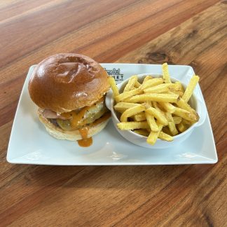 Hamburguesa de carn de bou "el Capricho" marcada a la brasa, pa brioche, cheddar fumat, bacó i salsa emmy amb un toc picant