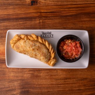 Empanada de carn criolla a l'estil argentí, fregida i a la graella amb salsa yasgua picant de tomàquet fresc, coriandre, llima i rocoto.