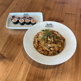 Yakisoba de pollo salteado con verduras frescas, acompañado de una selección de makis: 4 de atún y 4 de salmón.