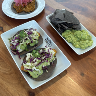 Cremoso guacamole con totopos crujientes, acompañado de una orden de tacos de lubina fresca (2 unidades) y un taco individual de cochinita pibil con todo su sabor tradicional.