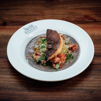 Carn d'ànec rostida, salsa tomàquet verd, coriandre, ceba i foie gras