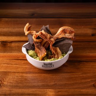 Guacamole tradicional servit amb totopos de blat de moro blau i rostes de porc cruixent.