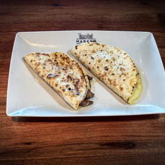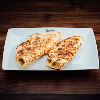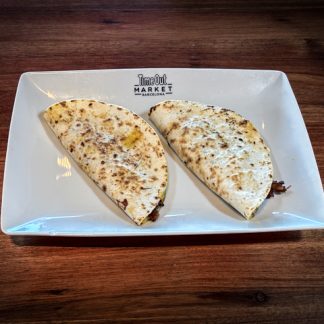 Quesadilla amb formatge Oaxaca, entranya a la planxa, ceba tendra, coriandre, salsa vermella i alvocat