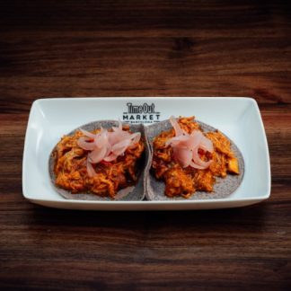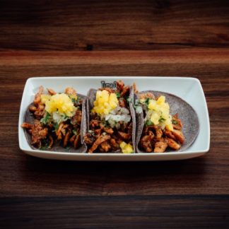 Porc duroc marinat amb axiot, espècies i cítrics. Servit amb havaner i ceba morada marinada