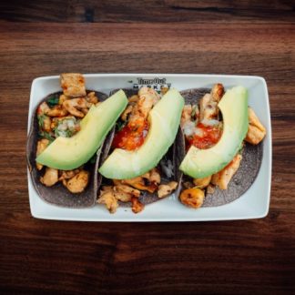 Quesadilla amb formatge Oaxaca, contra cuixa de pollastre a la planxa, ceba tendra, coriandre, salsa vermella i alvocat